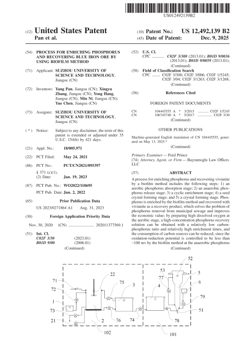废水低碳处理与资源化团队申请的国际发明专利“PROCESS FOR ENRICHING PHOSPHORUS AND RECOVERING BLUE IRON ORE BY USING BIOFILM METHOD”(生物膜富集磷及回收蓝铁矿的方法)喜获美国发明专利授权(授权号:US12492139B2)。此次获批授权表明小宝影院