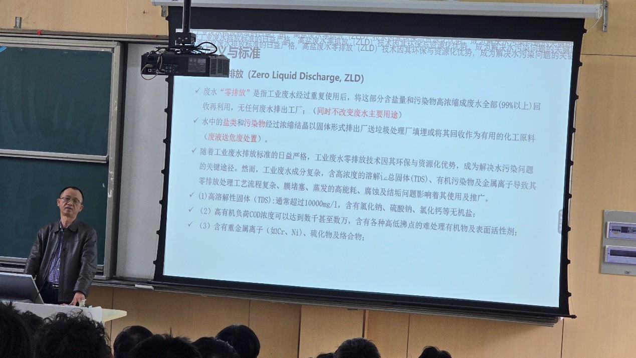 课上,黄评首先从政策导向与产业需求出发,系统阐述了工业企业零排放的背景、内涵与关键路径。他指出,在绿色发展理念深入人心的背景下,工业废水零排放已成为众多行业转型升级的必然趋势,掌握零排放工艺设计能力是环境工程专业学生未来职业发展的核心竞争力。随后,黄评结合公司多年来在环保工程领域积累的丰富经验,围绕预处理、膜浓缩、蒸发结晶等零排放核心工艺单元展开深入讲解,剖析了各单元的技术原理、适用条件及设计要点,帮助学生建立起从理论到实践的完整认知框架。